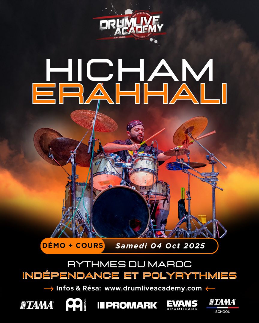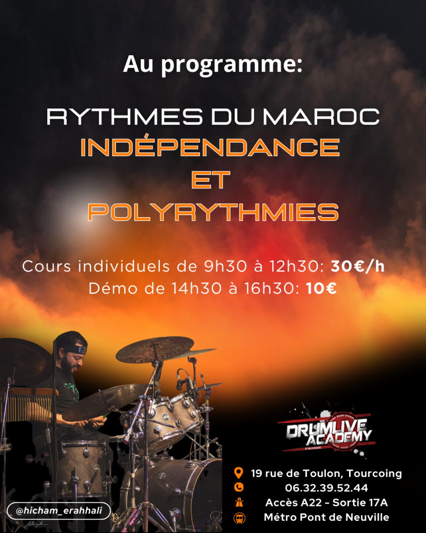 Pour marquer les 15ans de l’école de batterie, j’ai l’immense plaisir d’accueillir mon ami Hicham Erahhali, batteur talentueux venu spécialement du Maroc. Une journée unique pour célébrer la batterie, l’échange et l’ouverture vers d’autres cultures musicales.